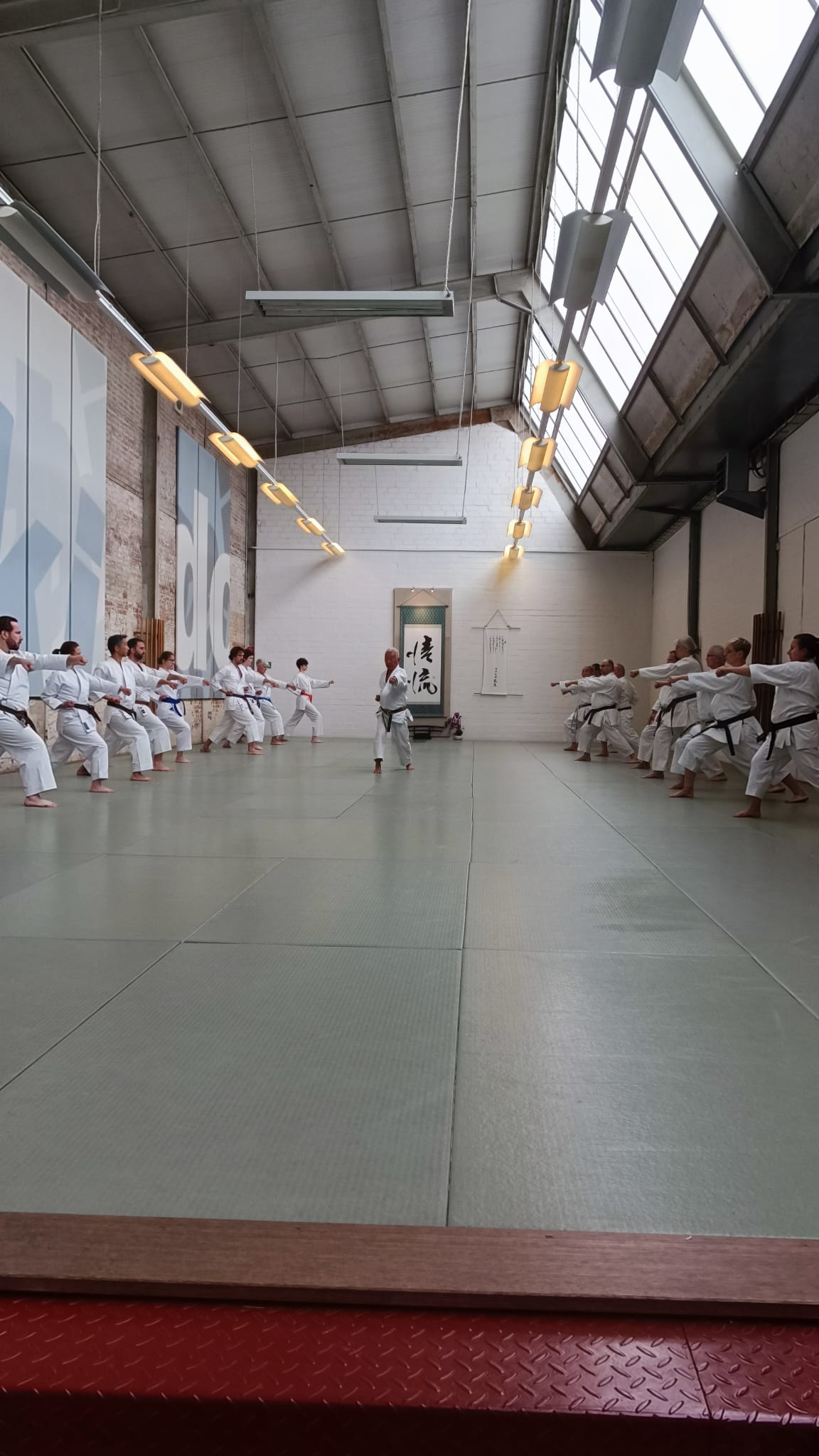 Matts Beschnidt (5. Dan JKA, Diplom Trainer und Bewegungswissenschaftler) vermittelte historische Hintergründe zur Entstehung des Karate auf Okinawa. Warum stehen wir so tief (Spoiler: Es war die fehlende Straßenbeleuchtung!)? Warum sind die ursprünglichen Katas alle mit offenen Händen bzw. warum sind bei uns die Hände geschlossen? Vermittelt wurde dies nicht theoretisch, sondern auch in der Praxis durch Üben der Naihanchi-Kata aus der die Tekki Shodan enstanden ist. Zusätzlich gab er wertvolle sportwissenschaftliche Tipps zu Warm-up und Mobilisierung.